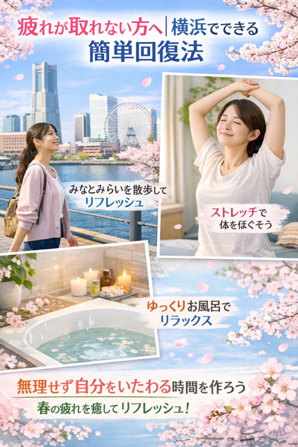 春は気温の変化や新生活の影響で、自律神経が乱れやすく「なんとなく疲れが抜けない」と感じる方が増える季節です。しっかり休んでいるはずなのにだるさが残る…そんな方に向けて、横浜で気軽にできる疲労回復法をご紹介します。